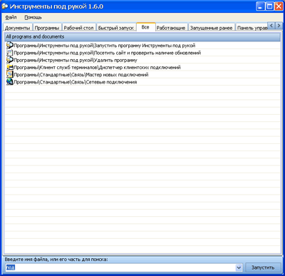 Описание:Основные возможности программы «Инструменты под рукой»: быстрый поиск программы или документа по части их названия; возможность запуска программы от имени другого пользователя; поддержка «горячих клавиш»; поиск запущенных процессов в памяти; поддержка функций безопасного быстрого выключения и перезагрузки компьютера; высокая совместимость с другими программами быстрого доступа к элементам меню «Пуск».